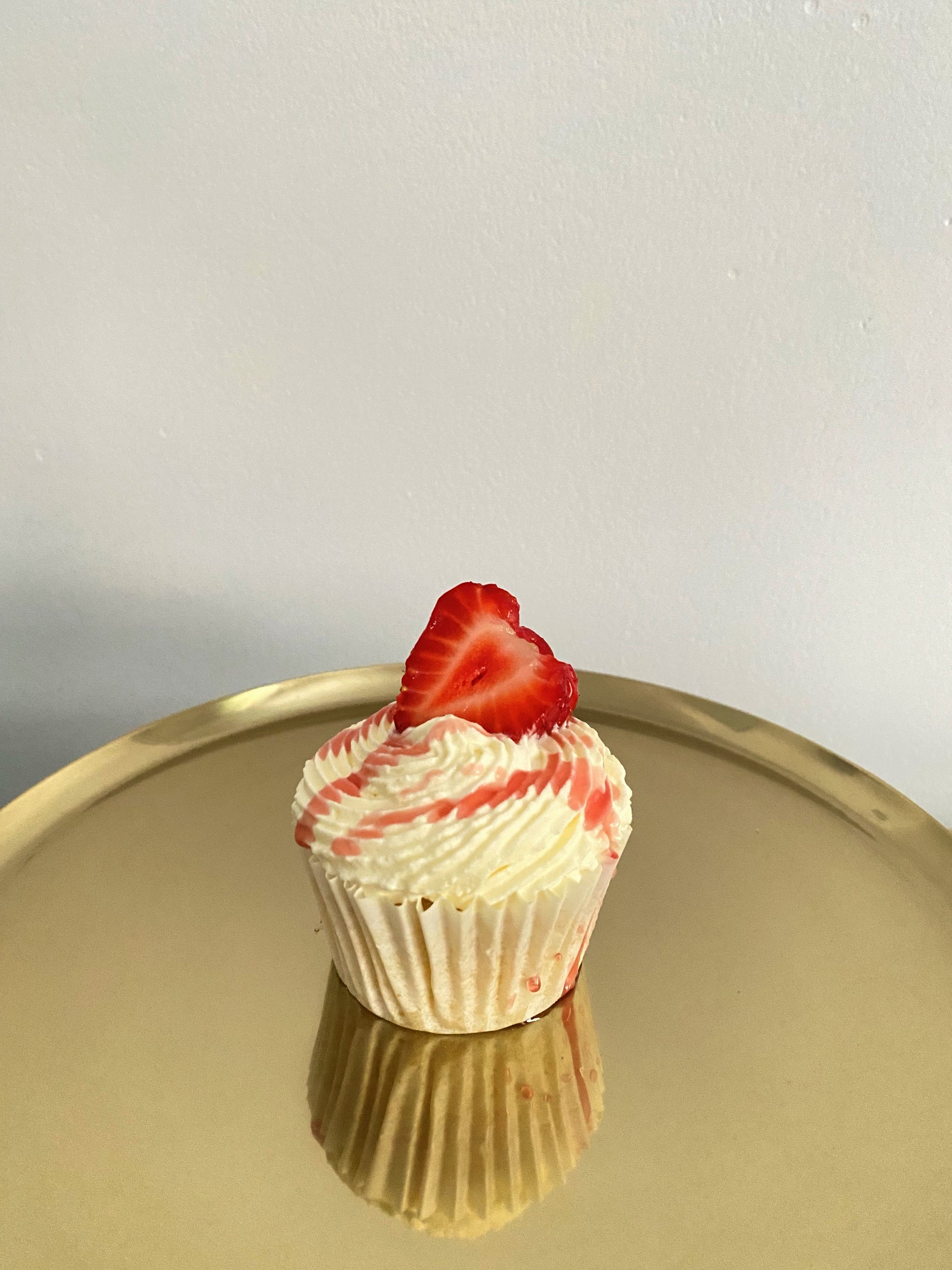 Description: Our classic Victoria cupcake. Fluffy vanilla sponge, filled with our sweet strawberry conserve, topped with Fresh cream.