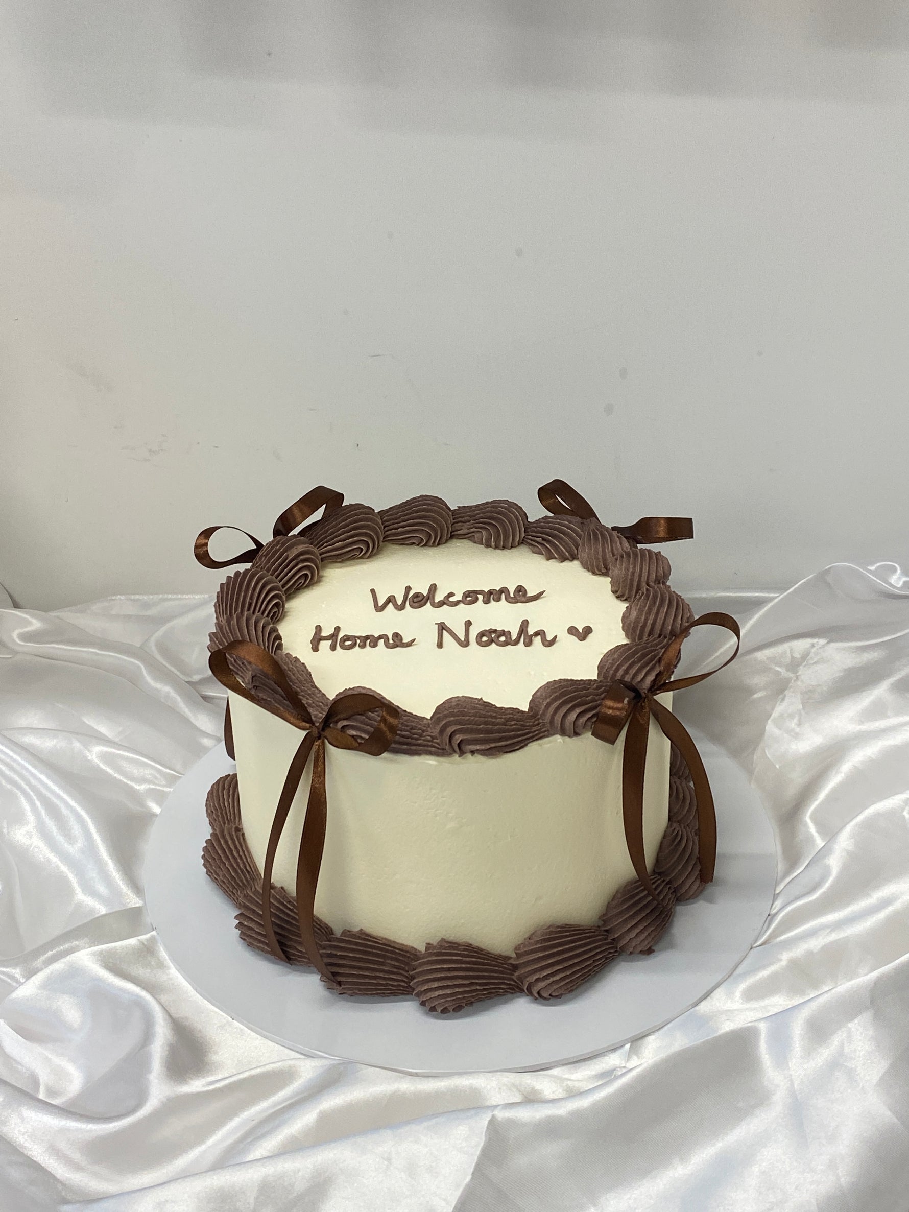 Unit price / perSay hello to our Coquette Bow Cake — the sweetest 2 layer cake that’s almost too cute to eat! This beauty is wrapped in soft, velvety buttercream and topped with delicate piping, forming the prettiest swirls all around the edges. Adorned with adorable satin ribbons tied into tiny bows, it’s the perfect blend of charm and elegance. Topped with a hand written message of your choice for an extra touch of magic, this cake is as delightful on the outside as it is on the inside with its light, fluffy sponge and creamy layers. Perfect for birthdays, tea parties, or any celebration that needs a sprinkle of sweetness!